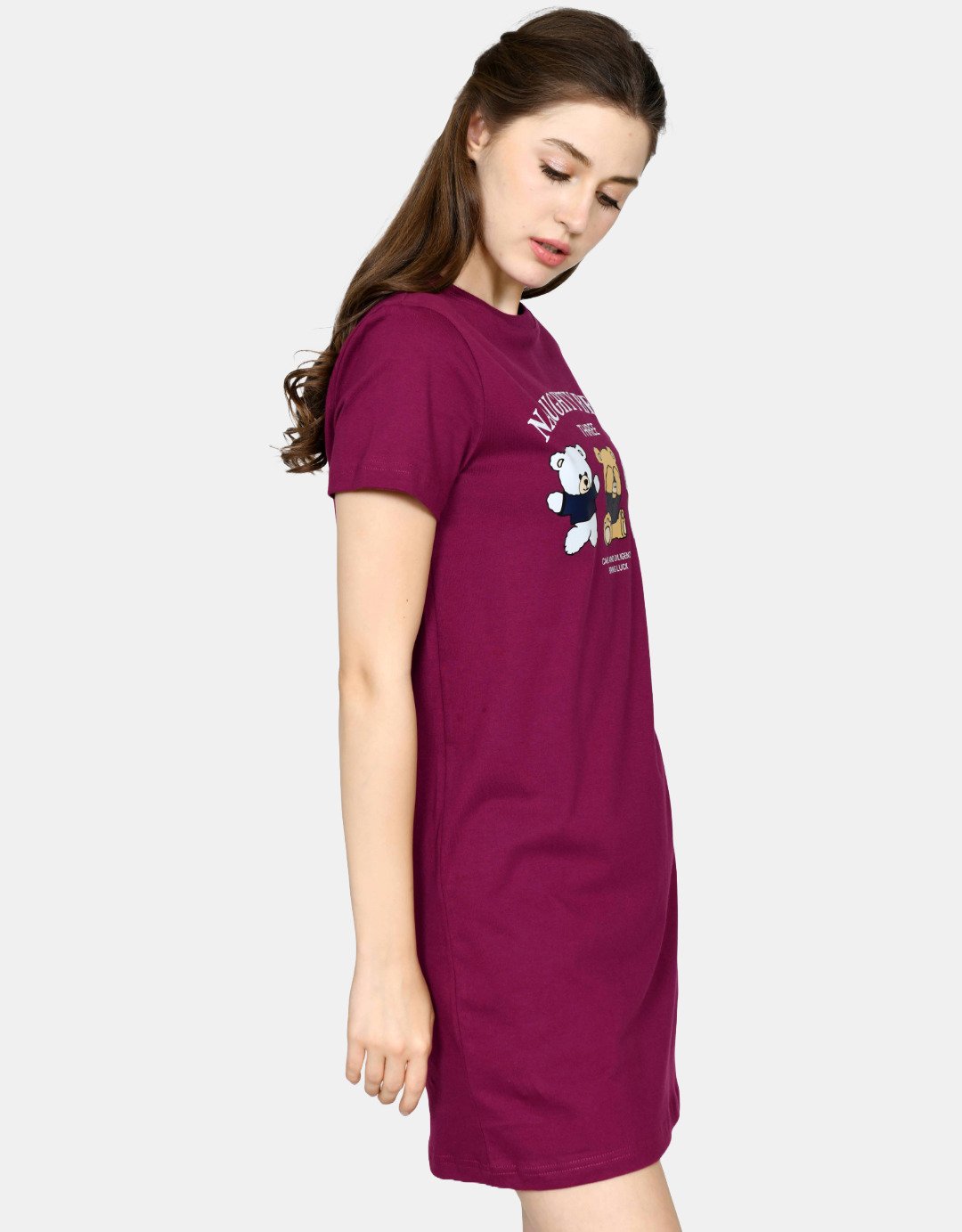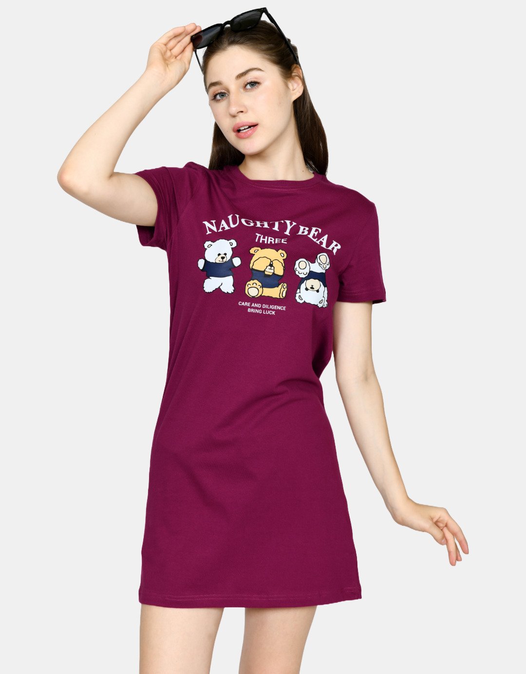 TONIQUE Kaos Dress Wanita Katun Combed Grafis Regular Fit NAUGHTY BEAR Cotton Combed 24s Regular Fit Graphic Tshirt Dress Maroon, Merah Marun Tee Dress